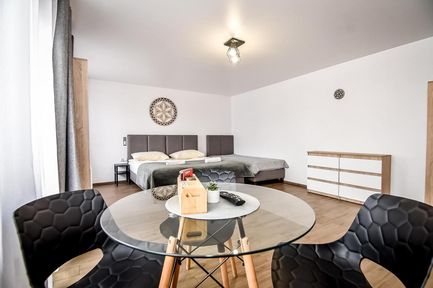 Studio. Guests can make meals in the kitchen that features a stovetop, a refrigerator and a microwave. The studio features a tea and coffee maker, a wardrobe, as well as a private bathroom boasting a shower and a hairdryer. The unit has 1 bed. Studio - 2 osobowy. Powierzchnia pokoju ok.: 14 mkw. ;