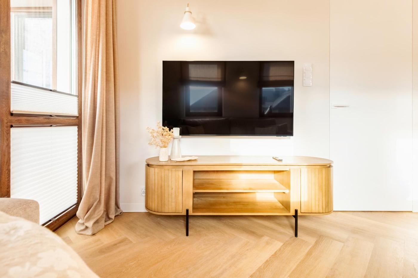 Apartament typu Suite z balkonem. This suite features 1 living room, 1 separate bedroom and 1 bathroom with a walk-in shower and free toiletries. Guests can make meals in the kitchen that has a stovetop, a refrigerator, a dishwasher and kitchenware. The air-conditioned suite features a flat-screen TV with cable channels, a washing machine, a tea and coffee maker, a seating area as well as garden views. The unit has 2 beds. Apartament typu Suite - 4 osobowy. Powierzchnia pokoju ok.: 42 mkw. ;